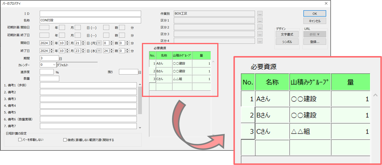 工程'sに登録した資源情報(人や機材)を工程線に割り当てることで、工程と資源を連動して管理できるようになります。