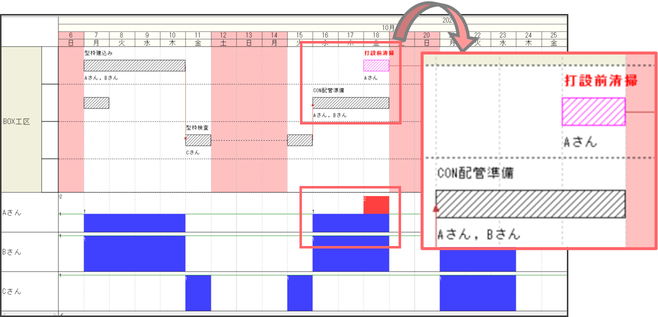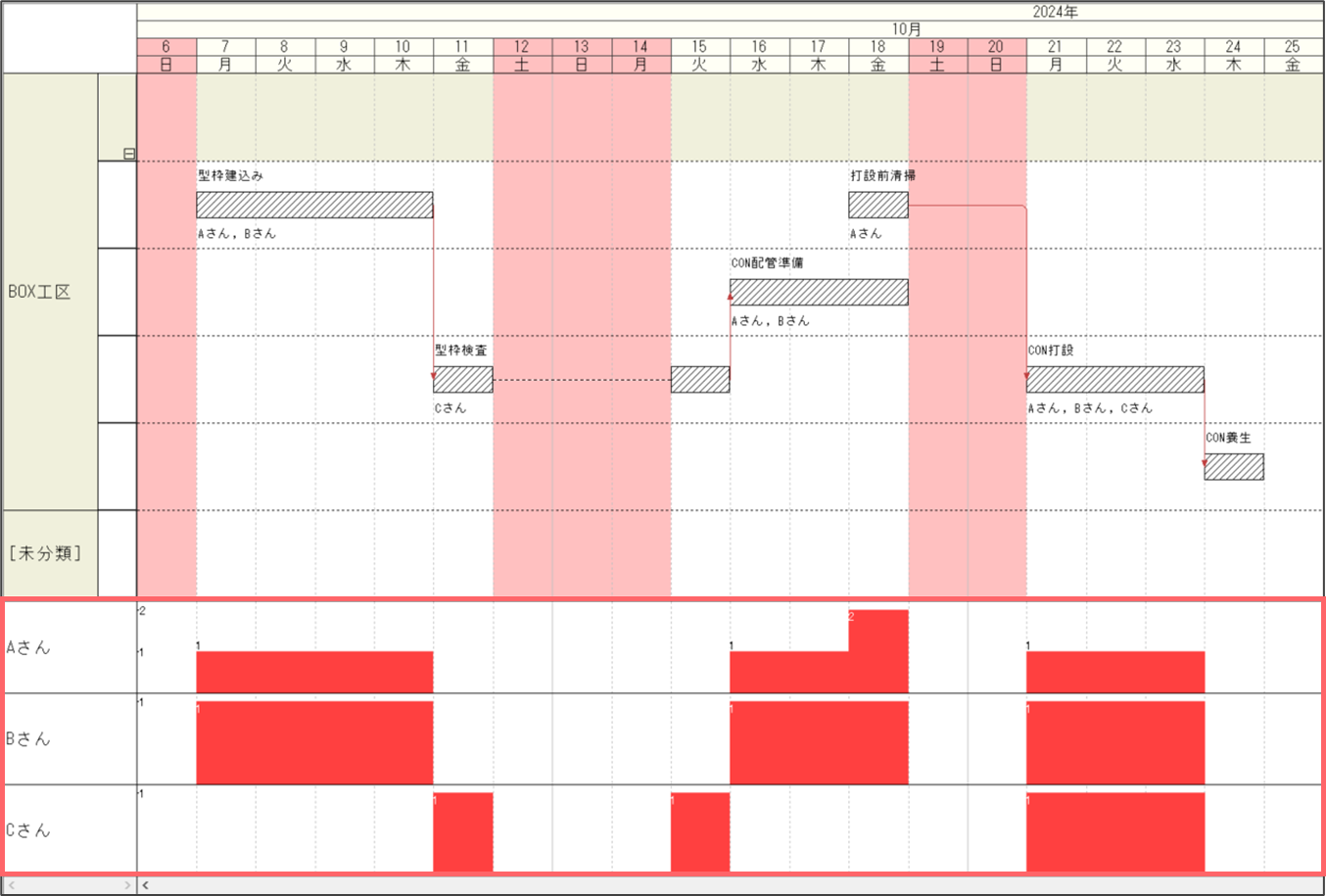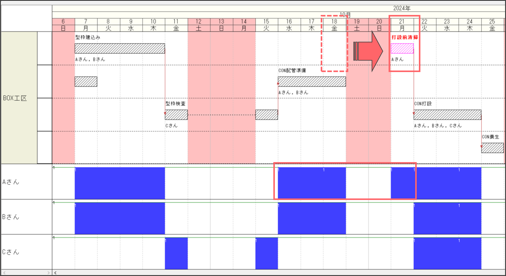 作業の日付をずらすことで資源が不足している日がなくなります。(例:10/18→10/21)