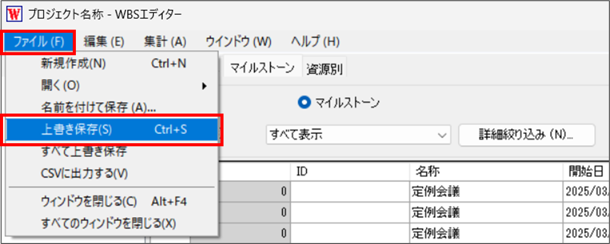 5.保存後「WBSエディター」のウィンドウを閉じると、作業の開始日・終了日が修正されます。