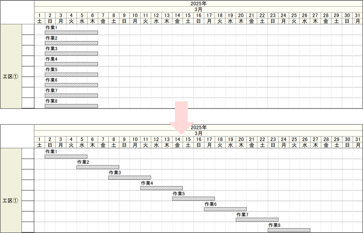 Excelなどで作成した表形式の情報を元に、工程表の作業バーをひとつひとつ参照することなく、まとめて作業日程を修正することができます。