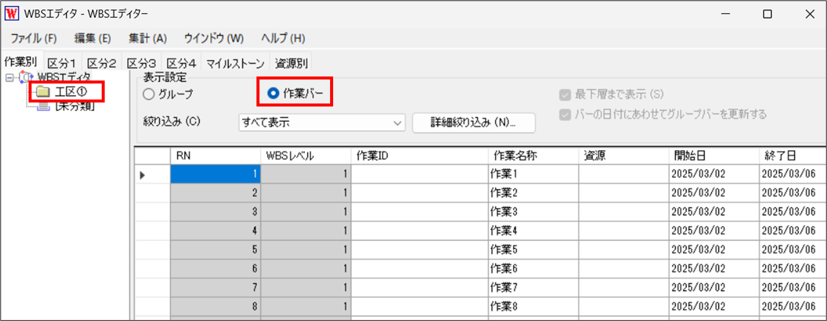 2.WBSエディターを起動し、ツリービューから該当のグループを選択>「作業バー」のチェックボックスにチェックを入れます。