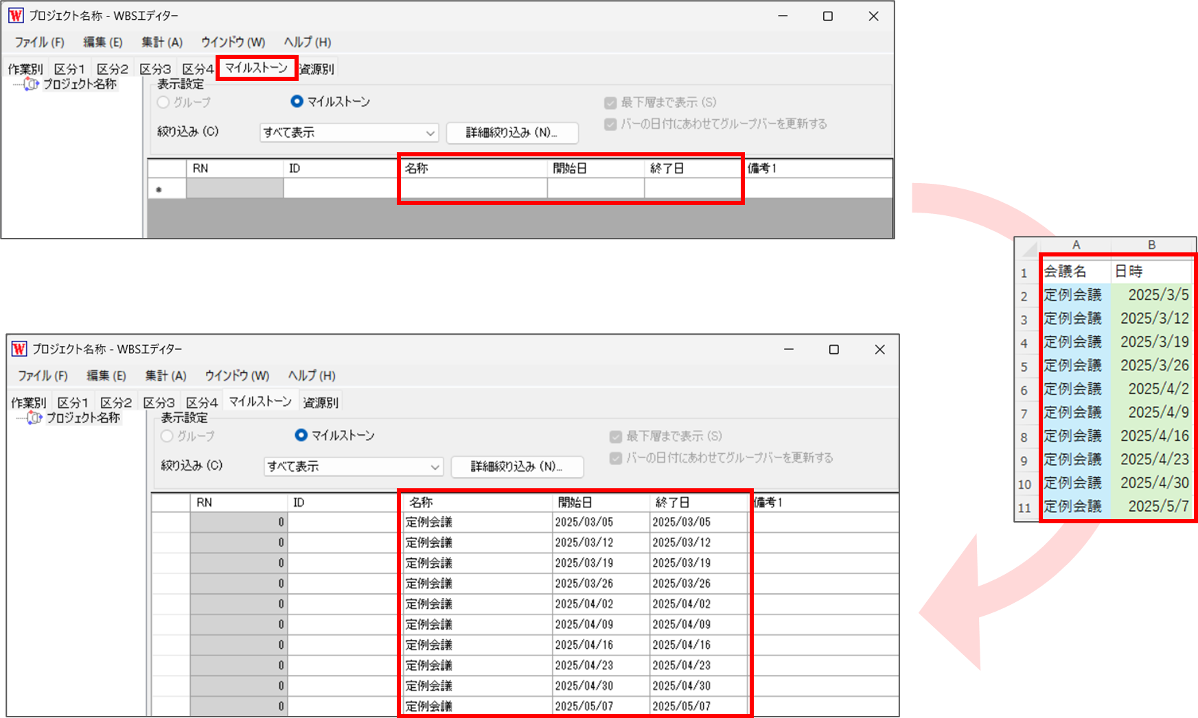 Excelなどで作成した表形式のマイルストーン情報をWBSエディターに貼り付けることで、マイルストーンを一括で作成することができます。