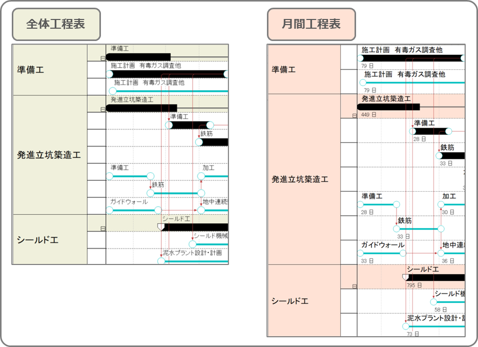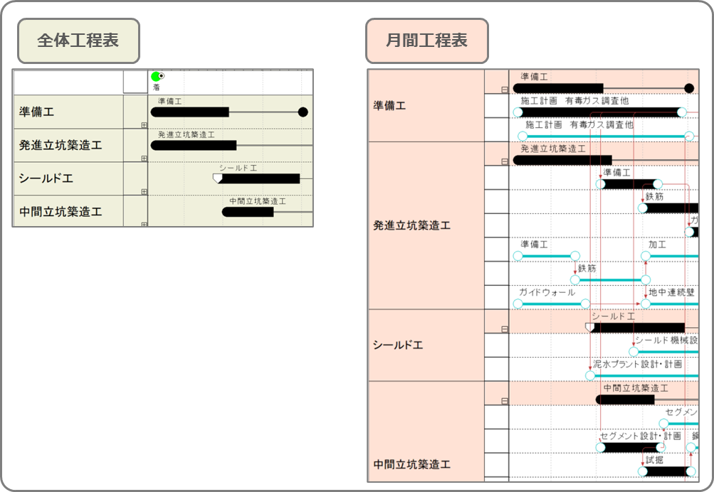 2.「全体工程表」はグループバーのみ、「月間工程表」では工程も確認したい!