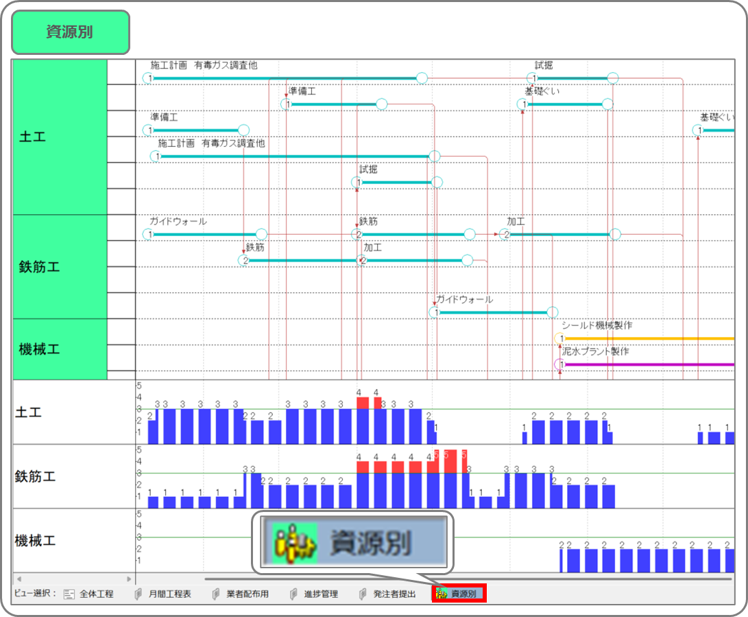 資源別ビューでは、資源ごとの作業日程がひと目でわかり、資源の配分や不可調整が効率的に行えます!